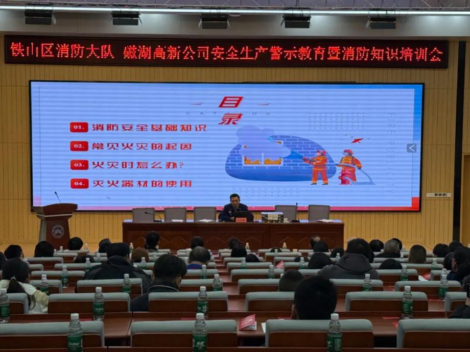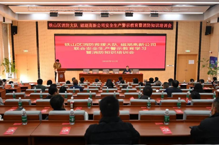 為深刻汲取近期火災事故教訓,全面壓實安全生產責任,切實提升園區整體消防安全管理水平,營造“119消防宣傳月”濃厚氛圍,鐵山區消防救援大隊與磁湖高新公司于11月19日聯合舉辦安全生產警示教育學習暨消防知識培訓會。會議聚焦“全民消防、生命至上——安全用火用電”主題,通過文件學習、警示教育、專業培訓、責任落實與設備保障等多措并舉,為企業安全生產與商戶安全經營注入強心劑。區消防救援大隊黨委書記徐耀,磁湖高新公司黨委副書記、總經理蔡華中出席會議并講話,園區企業安全負責人、商業門面承租戶代表等150余人參加會議。